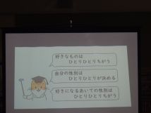 今日、12月9日月曜日5限目の総合は、LGBTQ「性の多様性」についての講演で、「ソラニジ・アカシ」代表の高橋朗(たかはしあき)さんをお招きし、性別とは何?については、男の子、女の子の普段の生活の価値観や名前のよび方、自分の性別は誰が決めるについての講演があり、これからの生活においての「性の多様化」について学ぶことが出来ました。