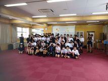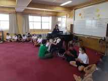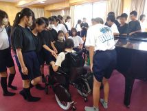 本日3校時音楽室で本校1年生58名と明石養護学校中学部1名の生徒と交流授業を行いました。全員でピアノの演奏に合わせて、リズムゲームを行い楽しいひと時を過ごしました。明石養護学校の生徒も笑顔で楽しそうでした。