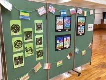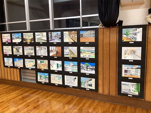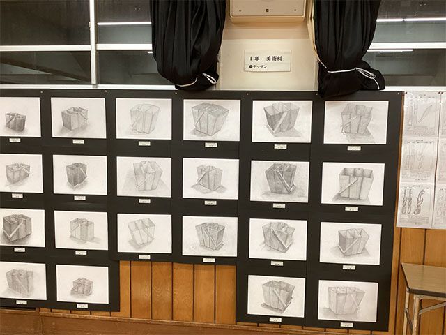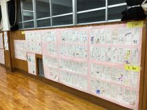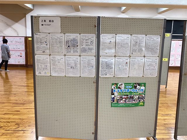 また、展示の部ではコミセン体育室に、科学部、英語部、各教科の作品を展示していました。