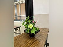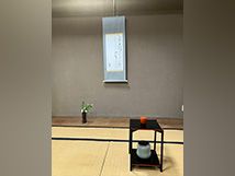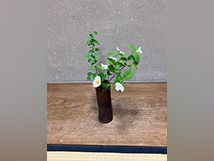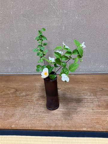 お茶席の床の間のお花は、白の山吹・花いかだ・日の出椿です。