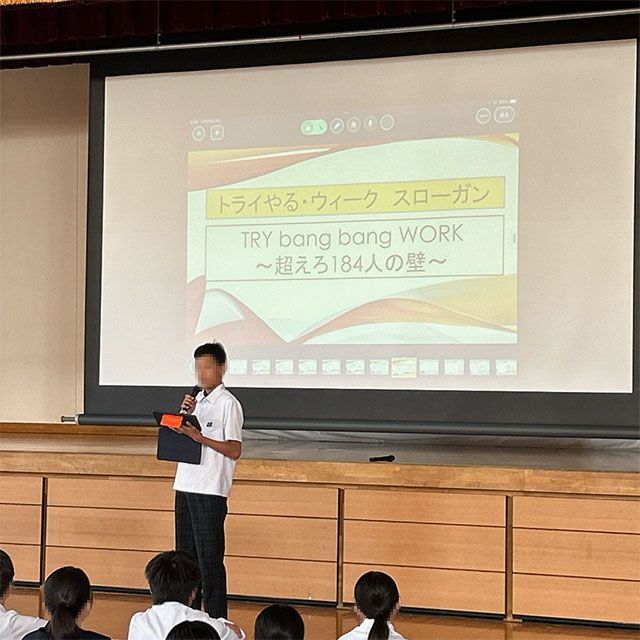 「TRY bang bang WORK ~超えろ184人の壁~」のスローガンのもと入念な準備をしてトライやるウィークがむかえれるようにしましょう。