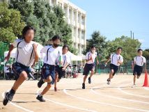 1年生は初めての体育大会を楽しみ、リレー種目から学年演技の集団行動まで一体感を持って取り組むことができました。